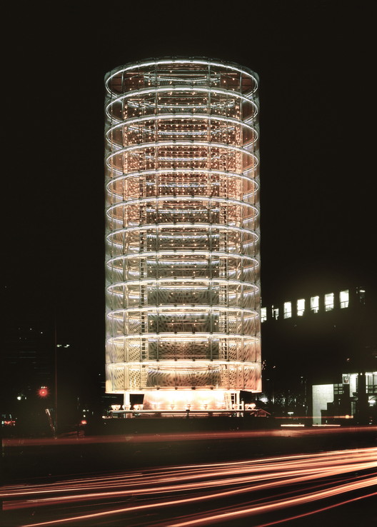 Durante o dia, sua superfície é composta por painéis de alumínio perfurado, que refletem a paisagem urbana e criam efeitos dinâmicos conforme a luz do sol.